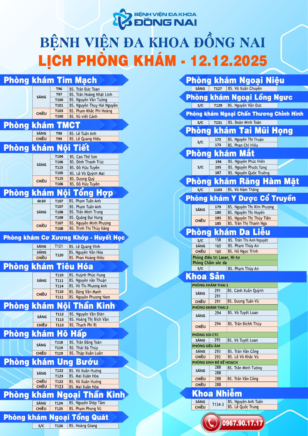 Bài liên quan Lịch khám bệnh ngày 11/12/2025 (08.12.2025 10:13) Lịch khám bệnh ngày 10/12/2025 (08.12.2025 10:11) Lịch khám bệnh ngày 09/12/2025 (08.12.2025 10:05) Lịch khám bệnh ngày 08/12/2025 (08.12.2025 10:02) Lịch khám bệnh ngày 07/12/2025 (05.12.2025 08:05) Lịch khám bệnh ngày 06/12/2025 (05.12.2025 08:02) Lịch khám bệnh ngày 05/12/2025 (30.11.2025 08:48) Lịch khám bệnh ngày 04/12/2025 (30.11.2025 08:47) Lịch khám bệnh ngày 03/12/2025 (30.11.2025 08:47) Lịch khám bệnh ngày 02/12/2025 (30.11.2025 08:46) Lịch khám bệnh ngày 01/12/2025 (30.11.2025 08:46) Lịch khám bệnh ngày 28/11/2025 (23.11.2025 09:10) Lịch khám bệnh ngày 27/11/2025 (23.11.2025 09:09) Lịch khám bệnh ngày 26/11/2025 (23.11.2025 09:08) Lịch khám bệnh ngày 25/11/2025 (23.11.2025 09:07) Lịch khám bệnh ngày 24/11/2025 (23.11.2025 09:03) Lịch khám bệnh ngày 23/11/2025 (23.11.2025 09:00) Lịch khám bệnh ngày 22/11/2025 (23.11.2025 08:53) Lịch khám bệnh ngày 21/11/2025 (17.11.2025 09:51) Lịch khám bệnh ngày 20/11/2025 (17.11.2025 09:49) 12345678910... DỊCH VỤ Phòng khám chuyên gia Khám và điều trị bệnh Tiêm chủng vắc xin Điều trị nội trú Tầm soát ung thư Khám tổng quát tầm soát bệnh Khám sức khỏe công ty Khám sức khỏe tầm soát bệnh TIN NỔI BẬT Danh sách học viên hoàn thành thực hành tại BVĐK Đồng Nai từ ngày 02.10.2025 đến 07.10.2025 Danh sách người hoàn thành thực hành tại bệnh viện Đa khoa Đồng Nai từ 20/8/2025 đến 10/9/2025 Danh sách Đăng ký thực hành tại bệnh viện Đa khoa Đồng Nai tháng 10 năm 2025 Danh sách học viên đăng kí thực hành KBCB tháng 12.2025 Danh sách hoàn thành quá trình thực hành tại BVĐK Đồng Nai từ ngày 09.10.2025 đến 06.11.2025 Thông báo tiếp nhận máu tại điểm hiến máu tình nguyện cố định Bệnh viện Đa khoa Đồng Nai Danh sách Đăng ký thực hành tại bệnh viện Đa khoa Đồng Nai tháng 11 năm 2025 Danh sách hoàn thành quá trình thực hành từ ngày 14.10.2025 đến 29.10.2025 Chào bảng giá gói thầu mua sắm thiết bị đầu cuối phục vụ triển khai Bệnh án điện tử (EMR) của Bệnh viện đa khoa Đồng Nai V/v chào bảng giá trang phục y tế của Bệnh viện đa khoa Đồng Nai