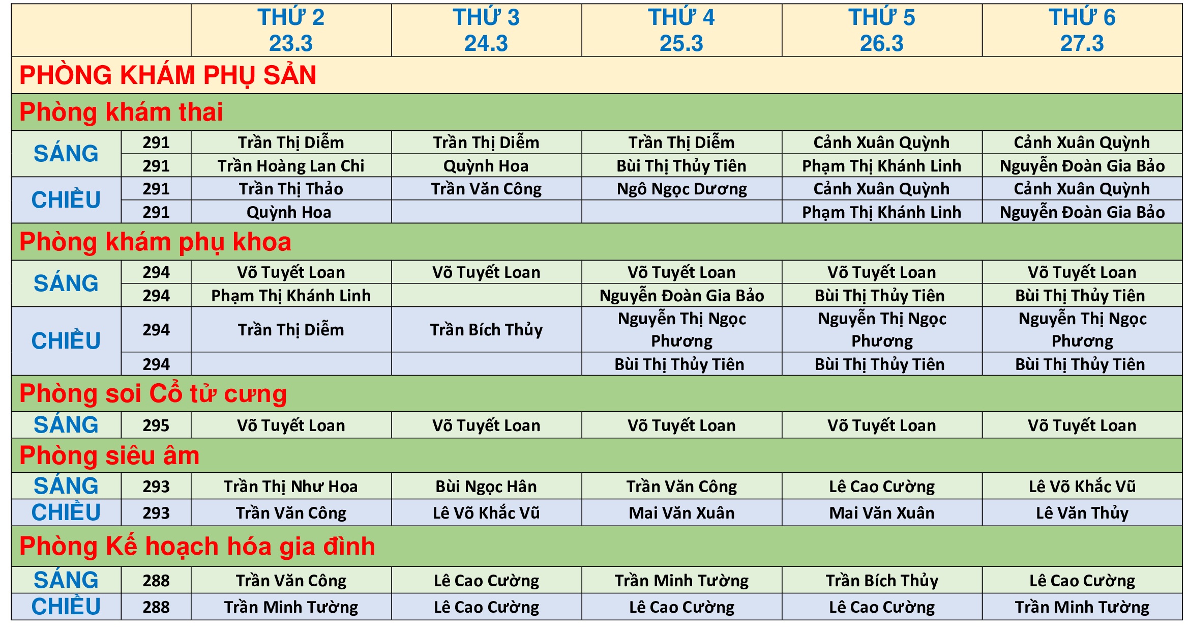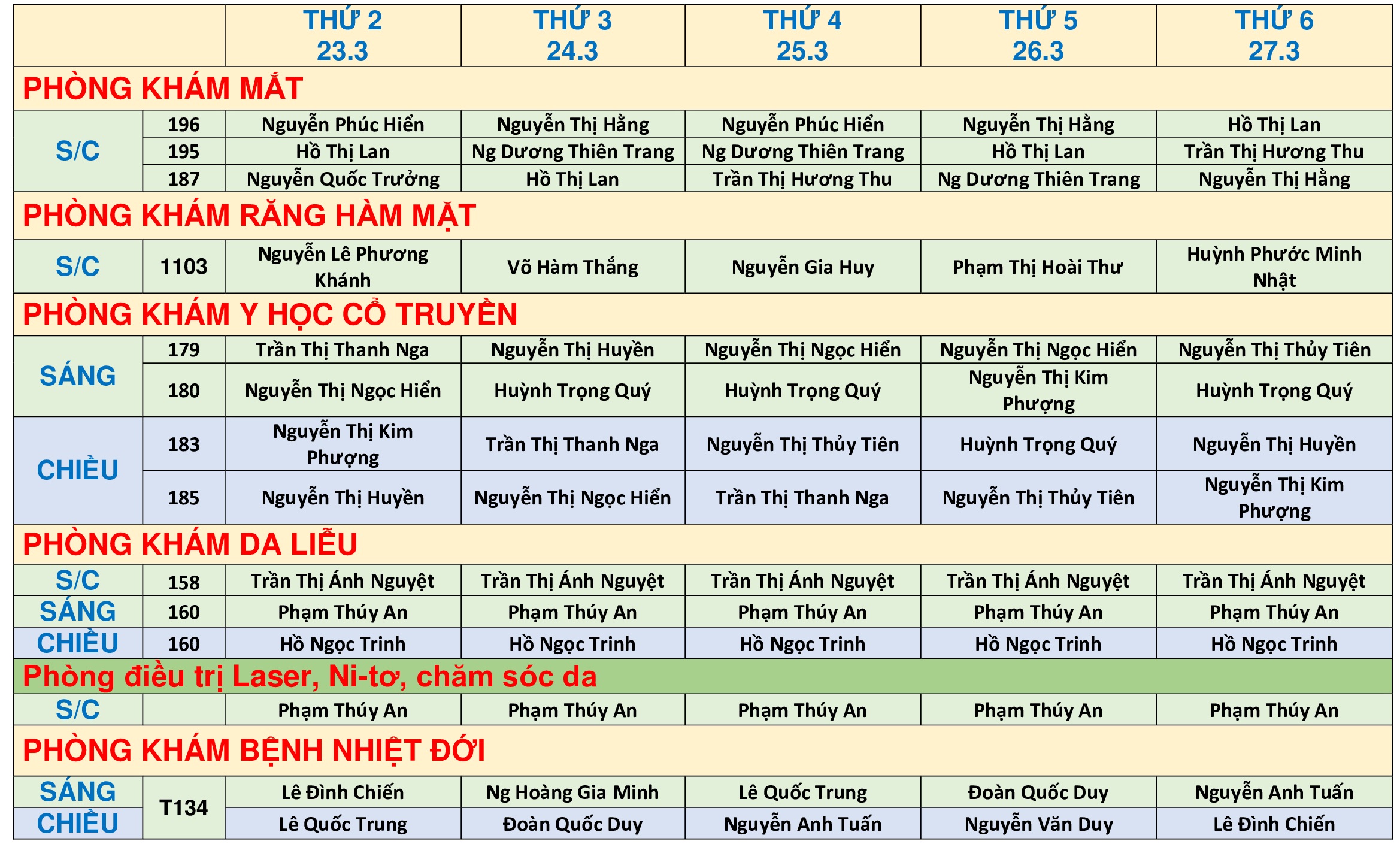 Lịch khám bệnh ngày 23-27/03/2026