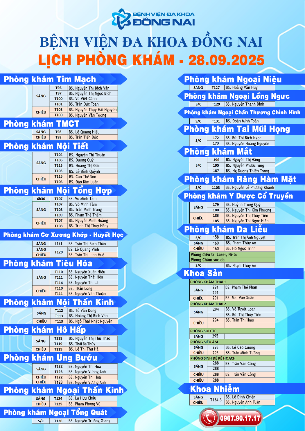 Bài liên quan Lịch khám bệnh ngày 14/11/2025 (09.11.2025 09:58) Lịch khám bệnh ngày 13/11/2025 (09.11.2025 09:58) Lịch khám bệnh ngày 12/11/2025 (09.11.2025 09:57) Lịch khám bệnh ngày 11/11/2025 (09.11.2025 09:57) Lịch khám bệnh ngày 10/11/2025 (09.11.2025 09:56) Lịch khám bệnh ngày 09/11/2025 (06.11.2025 08:23) Lịch khám bệnh ngày 08/11/2025 (06.11.2025 08:19) Lịch khám bệnh ngày 07/11/2025 (02.11.2025 08:47) Lịch khám bệnh ngày 06/11/2025 (02.11.2025 08:47) Lịch khám bệnh ngày 05/11/2025 (02.11.2025 08:47) Lịch khám bệnh ngày 04/11/2025 (02.11.2025 08:46) Lịch khám bệnh ngày 03/11/2025 (02.11.2025 08:46) Lịch khám bệnh ngày 02/11/2025 (31.10.2025 09:50) Lịch khám bệnh ngày 01/11/2025 (31.10.2025 09:47) Lịch khám bệnh ngày 31/10/2025 (28.10.2025 08:52) Lịch khám bệnh ngày 30/10/2025 (28.10.2025 08:47) Lịch khám bệnh ngày 29/10/2025 (28.10.2025 08:18) Lịch khám bệnh ngày 27/10/2025 (27.10.2025 10:10) Lịch khám bệnh ngày 26/10/2025 (24.10.2025 09:53) Lịch khám bệnh ngày 25/10/2025 (24.10.2025 09:39) 12345678910... DỊCH VỤ Phòng khám chuyên gia Khám và điều trị bệnh Tiêm chủng vắc xin Điều trị nội trú Tầm soát ung thư Khám tổng quát tầm soát bệnh Khám sức khỏe công ty Khám sức khỏe tầm soát bệnh TIN NỔI BẬT Danh sách học viên hoàn thành thực hành tại BVĐK Đồng Nai từ ngày 02.10.2025 đến 07.10.2025 Danh sách người hoàn thành thực hành tại bệnh viện Đa khoa Đồng Nai từ 20/8/2025 đến 10/9/2025 Danh sách Đăng ký thực hành tại bệnh viện Đa khoa Đồng Nai tháng 10 năm 2025 Danh sách hoàn thành quá trình thực hành tại BVĐK Đồng Nai từ ngày 09.10.2025 đến 06.11.2025 Thông báo tiếp nhận máu tại điểm hiến máu tình nguyện cố định Bệnh viện Đa khoa Đồng Nai Danh sách Đăng ký thực hành tại bệnh viện Đa khoa Đồng Nai tháng 11 năm 2025 Danh sách hoàn thành quá trình thực hành từ ngày 14.10.2025 đến 29.10.2025 Chào bảng giá gói thầu mua sắm thiết bị đầu cuối phục vụ triển khai Bệnh án điện tử (EMR) của Bệnh viện đa khoa Đồng Nai V/v chào bảng giá trang phục y tế của Bệnh viện đa khoa Đồng Nai Yêu cầubáo giá để tham khảo, xây dựng giá gói thầu, làm cơ sơ tổ chức lựa chọn nhà thầu mua sắm hóa chất xét nghiệm