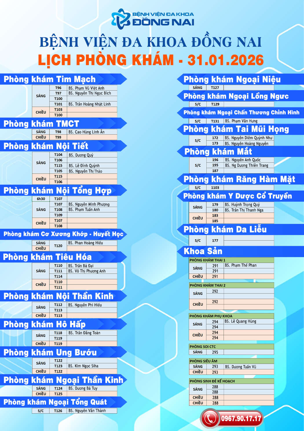 Bài liên quan Lịch khám bệnh ngày 01/02/2026 (01.02.2026 10:27) Lịch khám bệnh ngày 30/01/2026 (01.02.2026 10:27) Lịch khám bệnh ngày 29/01/2026 (01.02.2026 10:26) Lịch khám bệnh ngày 28/01/2026 (01.02.2026 10:26) Lịch khám bệnh ngày 27/01/2026 (01.02.2026 10:25) Lịch khám bệnh ngày 26/01/2026 (01.02.2026 10:25) Lịch khám bệnh ngày 25/01/2026 (24.01.2026 08:32) Lịch khám bệnh ngày 24/01/2026 (24.01.2026 08:28) Lịch khám bệnh ngày 23/01/2026 (19.01.2026 11:25) Lịch khám bệnh ngày 22/01/2026 (19.01.2026 10:46) Lịch khám bệnh ngày 21/01/2026 (19.01.2026 10:38) Lịch khám bệnh ngày 20/01/2026 (19.01.2026 10:02) Lịch khám bệnh ngày 19/01/2026 (19.01.2026 09:35) Lịch khám bệnh ngày 18/01/2026 (16.01.2026 08:08) Lịch khám bệnh ngày 17/01/2026 (16.01.2026 08:04) Lịch khám bệnh ngày 16/01/2026 (13.01.2026 06:38) Lịch khám bệnh ngày 15/01/2026 (13.01.2026 06:38) Lịch khám bệnh ngày 14/01/2026 (13.01.2026 06:37) Lịch khám bệnh ngày 13/01/2026 (12.01.2026 09:57) Lịch khám bệnh ngày 12/01/2026 (12.01.2026 09:28) 12345678910... DỊCH VỤ Phòng khám chuyên gia Khám và điều trị bệnh Tiêm chủng vắc xin Điều trị nội trú Tầm soát ung thư Khám tổng quát tầm soát bệnh Khám sức khỏe công ty Khám sức khỏe tầm soát bệnh TIN NỔI BẬT THÔNG BÁO BỆNH VIỆN ĐA KHOA ĐỒNG NAI ĐÁP ỨNG YÊU CẦU LÀ CƠ SỞ THỰC HÀNH KHÁM BỆNH CHỮA BỆNH 15.9.2025 DS hoàn thành quá trình thực hành từ ngày 30/12/2025 đến ngày 08/01/2026 Danh sách thực hành tại Bệnh viện Đa khoa Đồng Nai tháng 01 năm 2026 (Bổ sung) Danh sách Đăng ký thực hành dược tại bệnh viện Đa khoa Đồng Nai tháng 01.2026 Danh sách đăng kí thực hành tại BVĐK Đồng Nai tháng 01/2026 Danh sách học viên hoàn thành thực hành tại BVĐK Đồng Nai từ ngày 06.11.2025 đến 05.12.2025 Danh sách học viên đăng kí thực hành KBCB tháng 12.2025 Danh sách hoàn thành quá trình thực hành tại BVĐK Đồng Nai từ ngày 09.10.2025 đến 06.11.2025 Thông báo tiếp nhận máu tại điểm hiến máu tình nguyện cố định Bệnh viện Đa khoa Đồng Nai Danh sách Đăng ký thực hành tại bệnh viện Đa khoa Đồng Nai tháng 11 năm 2025
