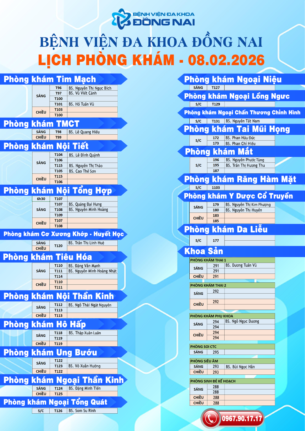 Bài liên quan Lịch khám bệnh ngày 10/02/2026 (09.02.2026 10:48) Lịch khám bệnh ngày 09/02/2026 (09.02.2026 10:46) Lịch khám bệnh ngày 07/02/2026 (06.02.2026 07:55) Lịch khám bệnh ngày 06/02/2026 (02.02.2026 10:41) Lịch khám bệnh ngày 05/02/2026 (02.02.2026 10:41) Lịch khám bệnh ngày 04/02/2026 (02.02.2026 10:40) Lịch khám bệnh ngày 03/02/2026 (02.02.2026 10:40) Lịch khám bệnh ngày 02/02/2026 (02.02.2026 10:40) Lịch khám bệnh ngày 01/02/2026 (01.02.2026 10:27) Lịch khám bệnh ngày 31/01/2026 (01.02.2026 10:27) Lịch khám bệnh ngày 30/01/2026 (01.02.2026 10:27) Lịch khám bệnh ngày 29/01/2026 (01.02.2026 10:26) Lịch khám bệnh ngày 28/01/2026 (01.02.2026 10:26) Lịch khám bệnh ngày 27/01/2026 (01.02.2026 10:25) Lịch khám bệnh ngày 26/01/2026 (01.02.2026 10:25) Lịch khám bệnh ngày 25/01/2026 (24.01.2026 08:32) Lịch khám bệnh ngày 24/01/2026 (24.01.2026 08:28) Lịch khám bệnh ngày 23/01/2026 (19.01.2026 11:25) Lịch khám bệnh ngày 22/01/2026 (19.01.2026 10:46) Lịch khám bệnh ngày 21/01/2026 (19.01.2026 10:38) 12345678910... DỊCH VỤ Phòng khám chuyên gia Khám và điều trị bệnh Tiêm chủng vắc xin Điều trị nội trú Tầm soát ung thư Khám tổng quát tầm soát bệnh Khám sức khỏe công ty Khám sức khỏe tầm soát bệnh TIN NỔI BẬT THÔNG BÁO BỆNH VIỆN ĐA KHOA ĐỒNG NAI ĐÁP ỨNG YÊU CẦU LÀ CƠ SỞ THỰC HÀNH KHÁM BỆNH CHỮA BỆNH 15.9.2025 Danh sách hoàn thành thực hành tại BVĐK Đồng Nai tháng 02.2026 DS hoàn thành quá trình thực hành từ ngày 30/12/2025 đến ngày 08/01/2026 Danh sách thực hành tại Bệnh viện Đa khoa Đồng Nai tháng 01 năm 2026 (Bổ sung) Danh sách Đăng ký thực hành dược tại bệnh viện Đa khoa Đồng Nai tháng 01.2026 Danh sách đăng kí thực hành tại BVĐK Đồng Nai tháng 01/2026 Danh sách học viên hoàn thành thực hành tại BVĐK Đồng Nai từ ngày 06.11.2025 đến 05.12.2025 Danh sách học viên đăng kí thực hành KBCB tháng 12.2025 Danh sách hoàn thành quá trình thực hành tại BVĐK Đồng Nai từ ngày 09.10.2025 đến 06.11.2025 Thông báo tiếp nhận máu tại điểm hiến máu tình nguyện cố định Bệnh viện Đa khoa Đồng Nai
