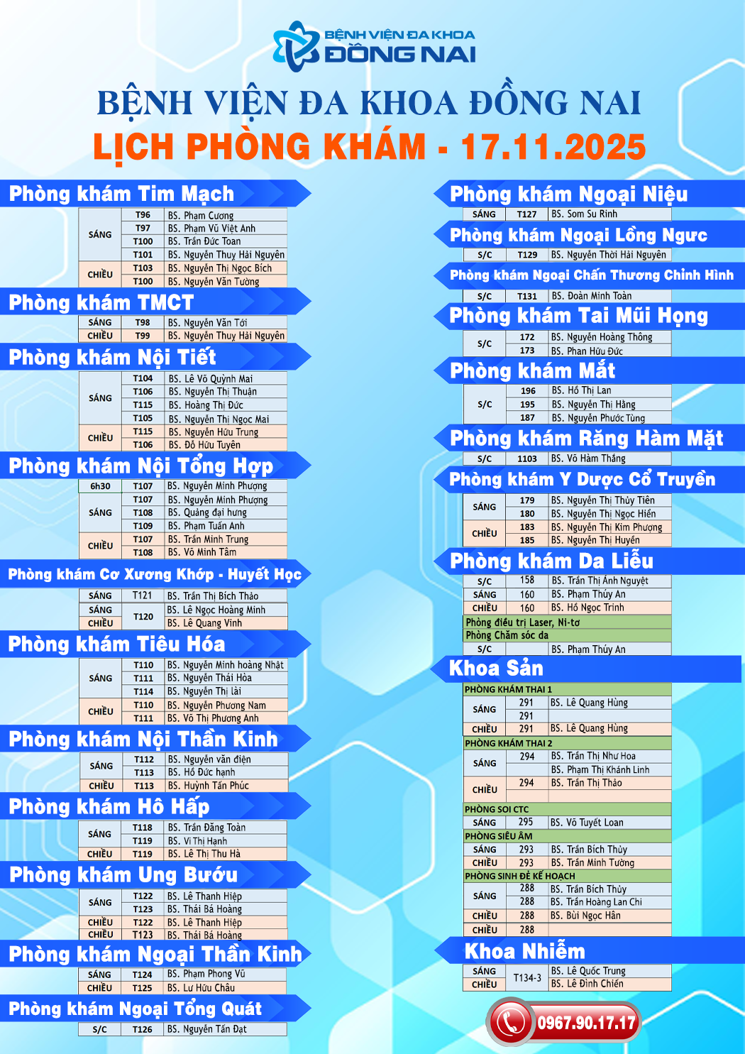 Bài liên quan Lịch khám bệnh ngày 07/12/2025 (05.12.2025 08:05) Lịch khám bệnh ngày 06/12/2025 (05.12.2025 08:02) Lịch khám bệnh ngày 05/12/2025 (30.11.2025 08:48) Lịch khám bệnh ngày 04/12/2025 (30.11.2025 08:47) Lịch khám bệnh ngày 03/12/2025 (30.11.2025 08:47) Lịch khám bệnh ngày 02/12/2025 (30.11.2025 08:46) Lịch khám bệnh ngày 01/12/2025 (30.11.2025 08:46) Lịch khám bệnh ngày 28/11/2025 (23.11.2025 09:10) Lịch khám bệnh ngày 27/11/2025 (23.11.2025 09:09) Lịch khám bệnh ngày 26/11/2025 (23.11.2025 09:08) Lịch khám bệnh ngày 25/11/2025 (23.11.2025 09:07) Lịch khám bệnh ngày 24/11/2025 (23.11.2025 09:03) Lịch khám bệnh ngày 23/11/2025 (23.11.2025 09:00) Lịch khám bệnh ngày 22/11/2025 (23.11.2025 08:53) Lịch khám bệnh ngày 21/11/2025 (17.11.2025 09:51) Lịch khám bệnh ngày 20/11/2025 (17.11.2025 09:49) Lịch khám bệnh ngày 19/11/2025 (17.11.2025 09:43) Lịch khám bệnh ngày 18/11/2025 (17.11.2025 09:43) Lịch khám bệnh ngày 16/11/2025 (14.11.2025 10:10) Lịch khám bệnh ngày 15/11/2025 (14.11.2025 09:54) 12345678910... DỊCH VỤ Phòng khám chuyên gia Khám và điều trị bệnh Tiêm chủng vắc xin Điều trị nội trú Tầm soát ung thư Khám tổng quát tầm soát bệnh Khám sức khỏe công ty Khám sức khỏe tầm soát bệnh TIN NỔI BẬT Danh sách học viên hoàn thành thực hành tại BVĐK Đồng Nai từ ngày 02.10.2025 đến 07.10.2025 Danh sách người hoàn thành thực hành tại bệnh viện Đa khoa Đồng Nai từ 20/8/2025 đến 10/9/2025 Danh sách Đăng ký thực hành tại bệnh viện Đa khoa Đồng Nai tháng 10 năm 2025 Danh sách học viên đăng kí thực hành KBCB tháng 12.2025 Danh sách hoàn thành quá trình thực hành tại BVĐK Đồng Nai từ ngày 09.10.2025 đến 06.11.2025 Thông báo tiếp nhận máu tại điểm hiến máu tình nguyện cố định Bệnh viện Đa khoa Đồng Nai Danh sách Đăng ký thực hành tại bệnh viện Đa khoa Đồng Nai tháng 11 năm 2025 Danh sách hoàn thành quá trình thực hành từ ngày 14.10.2025 đến 29.10.2025 Chào bảng giá gói thầu mua sắm thiết bị đầu cuối phục vụ triển khai Bệnh án điện tử (EMR) của Bệnh viện đa khoa Đồng Nai V/v chào bảng giá trang phục y tế của Bệnh viện đa khoa Đồng Nai